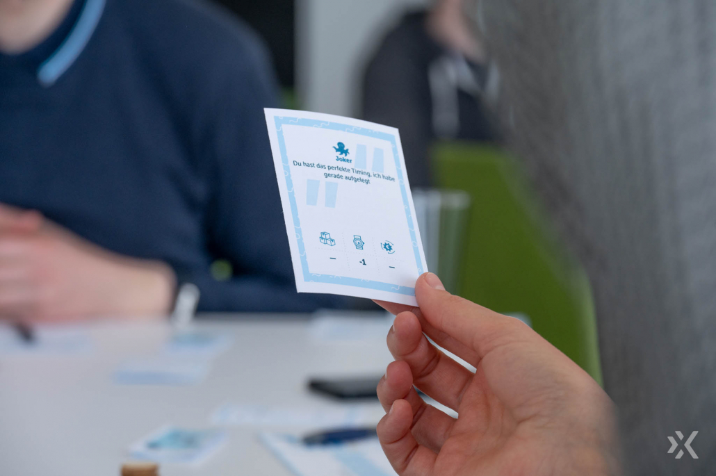 In „Das Projektmanagement-Spiel“ musste jeder Spielende unter Zuhilfenahme der zugeteilten Zeitchips und “xionen” (Währung) sein Projekt (Scope) fertigstellen. Ereigniskarten mit Situationen aus dem echten Projektmanagement-Leben konnten einen dabei zurückwerfen oder auch helfen, schneller zum Ziel zu gelangen. Besonders beliebt war die Ereigniskarte „Tanzen“ — außer bei den Unglücklichen, die dann tatsächlich ein Tänzchen aufs Parkett legen mussten